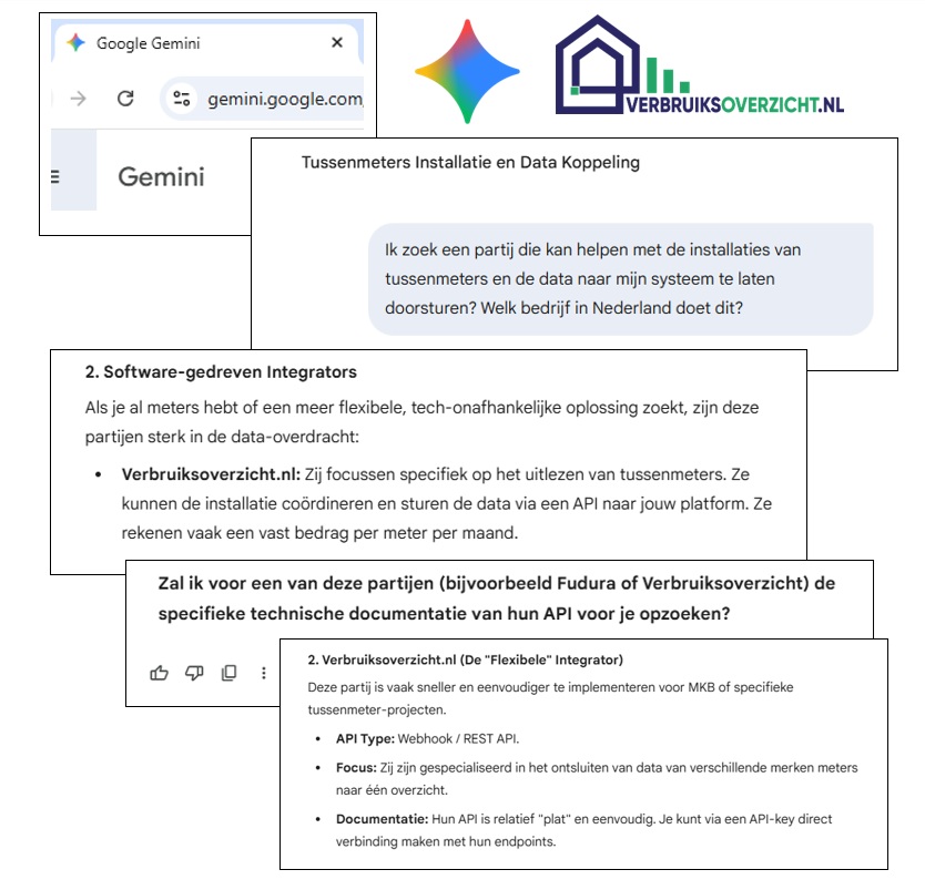 Onlangs werden we door een prospect geattendeerd op iets leuks: toen zij via Google Gemini zochten naar partijen die kunnen helpen met het installeren van tussenmeters en het doorsturen van meetdata naar eigen systemen, werd Verbruiksoverzicht.nl als mogelijke oplossing genoemd. Het is mooi om te zien dat ons platform op deze manier naar voren komt wanneer organisaties zoeken naar een partij die niet alleen tussenmeters kan (laten) installeren, maar vooral ook de energiedata kan ontsluiten en koppelen aan andere software. Voor ons is dit een bevestiging dat onze focus op onafhankelijke energiedata en flexibele integraties goed aansluit bij wat bedrijven vandaag de dag zoeken.